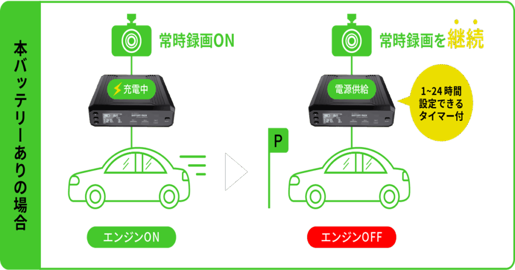 ドライブレコーダー用バッテリーを使用することで、エンジンを切った状態でもドライブレコーダーに安定した電力を供給し、駐車中のトラブルや万が一の事故を記録することが可能です。