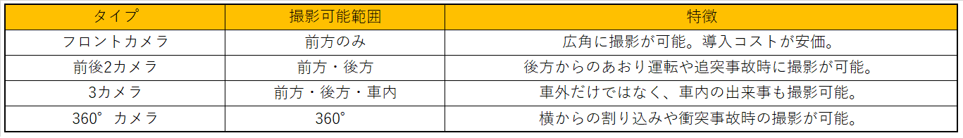 ドライブレコーダーも撮影したい範囲によってさまざまな種類があり、それぞれ撮影可能範囲が異なります。
